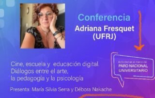 IX Congresso AsAECA - El destino de las imágenes Conferência Adriana Fresquet - UFRJ Cine, escuela e educacion digital. Diálogos entre el artes; la pedagogia y la psicología. Presente: Maria Sílvia Serra y Debora Nakashe Quinta Feira, dia 14 de março, 14:30 até 16h Faculdade de Ciencia Sociales Humberto Primo 1265 Buenos Aires