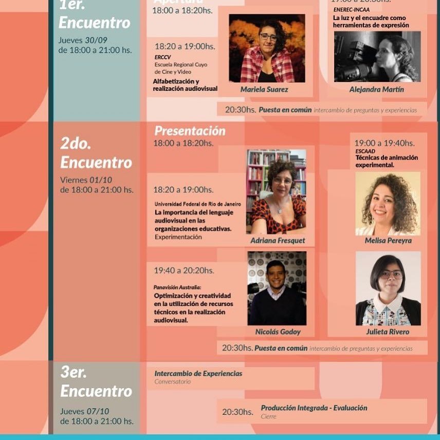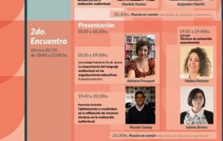 Adriana Fresquet (Universidade Federal do Rio de Janeiro) :“A importância da linguagem audiovisual nas organizações educativas”. Melisa Pereyra e Julieta Rivero (Escola de Animação ESCAAD): “Técnicas de animação experimental”. Nicolás Godoy (PANAVISÃO, Austrália): “Otimização e criatividade na utilização de recursos técnicos na realização audiovisual. ” https://www.youtube.com/watch?v=8pjMSJbW-b4&feature=youtu.be